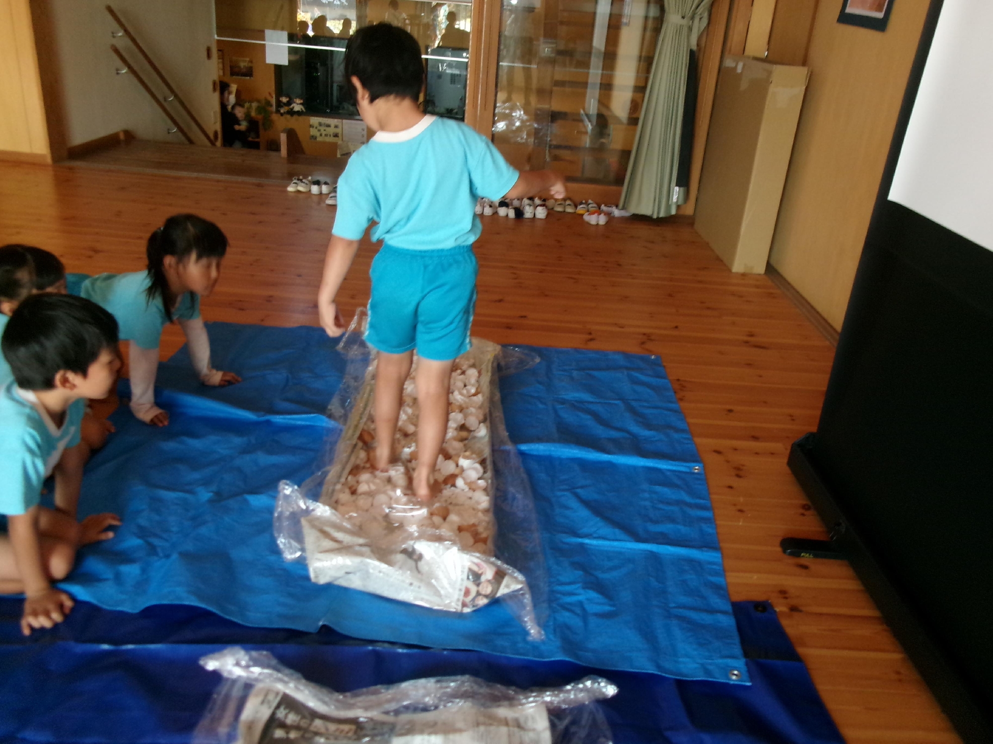 5歳児は、窓ガラスが割れたことを想定して、卵の殻(ガラスに見立てて)の上を歩く体験をし、2歳児も、お兄さんお姉さんたちが歩いているのを見て自分たちも歩いたり、触ったりしてみました。