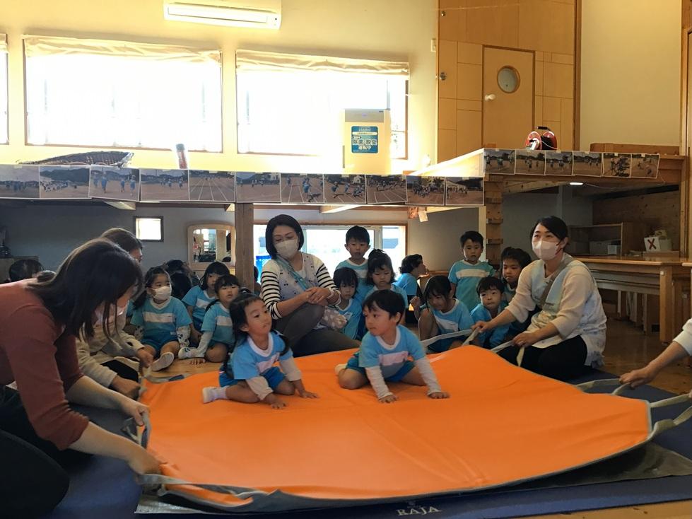 3・4歳児は、地震の揺れを体験するマット『YURETA』(ユレタ)の上で、避難の姿勢『カエルポーズ』で危険な物が落ちてこないかを確認しながら、揺れが収まるのを待ちました。