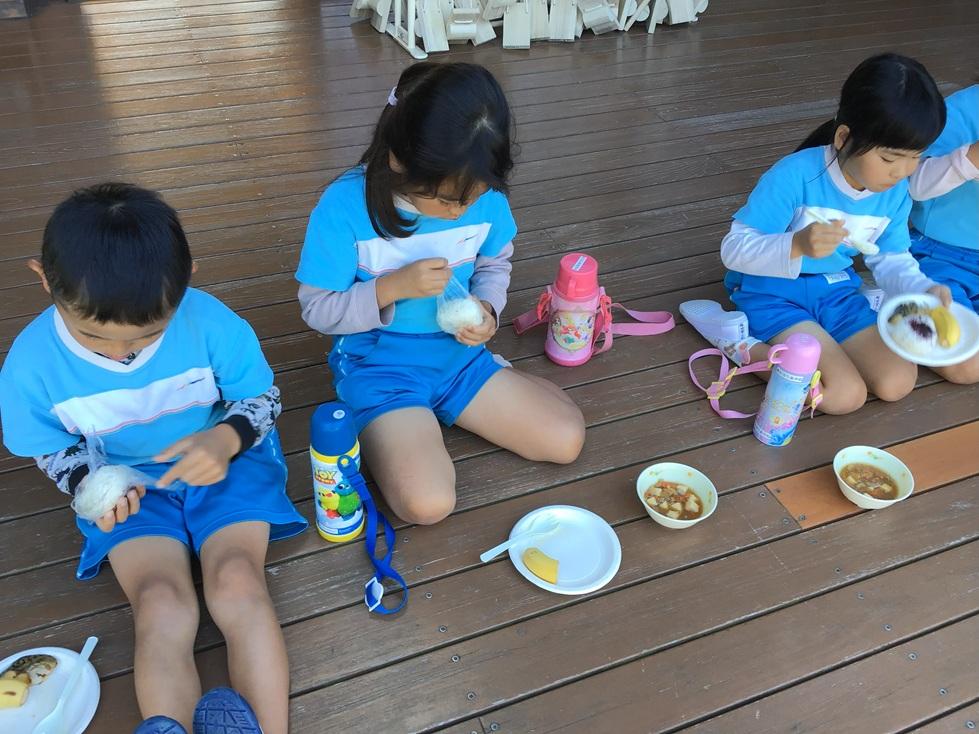 昼食は料理を紙皿に盛り、室内は入室不可の想定だったためウッドデッキでいただきました。(5歳児)