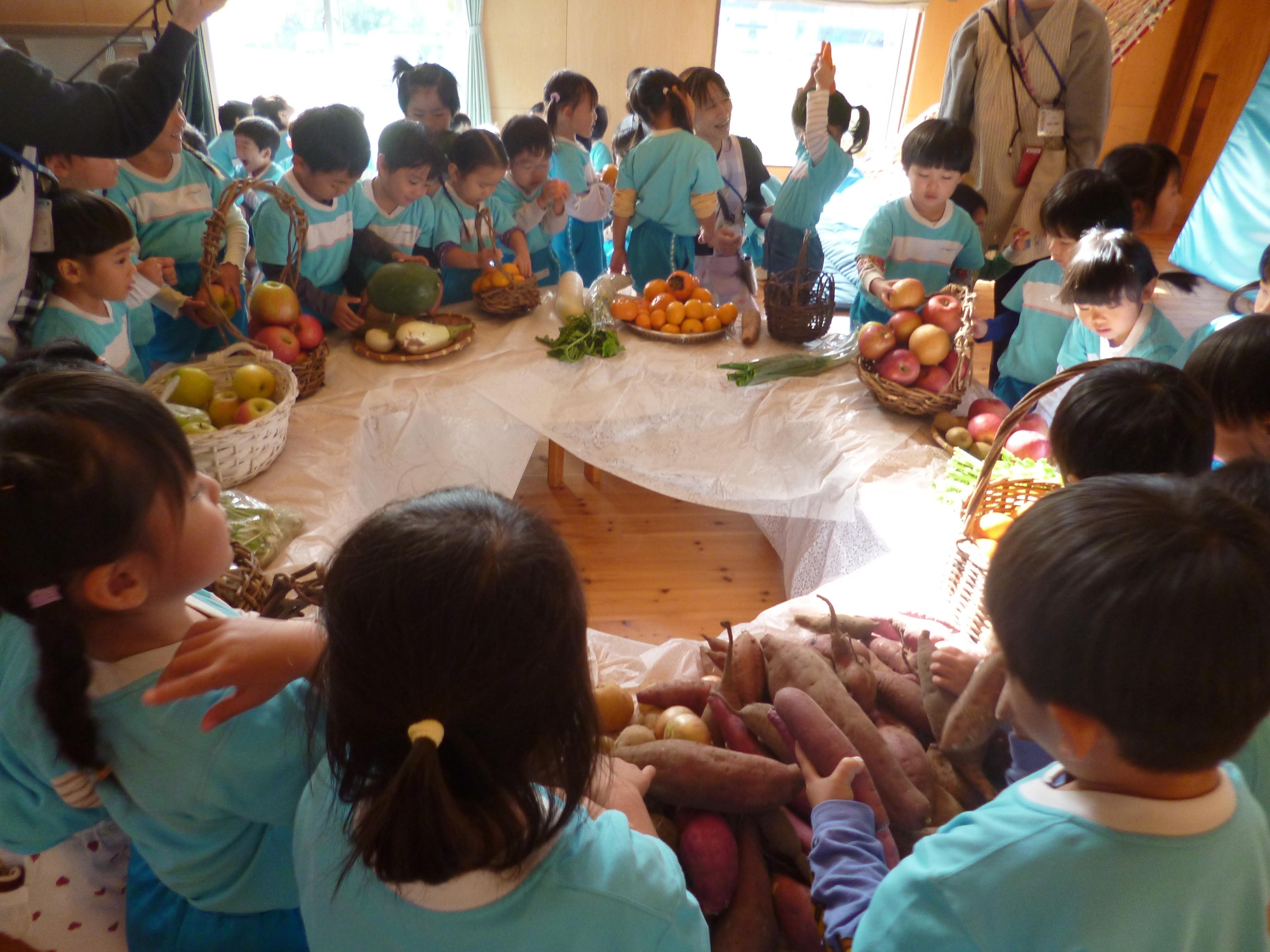 その後は、たくさんの果物や野菜を前に、賛美歌「はたけにおやさい」を歌って礼拝を行いました。
