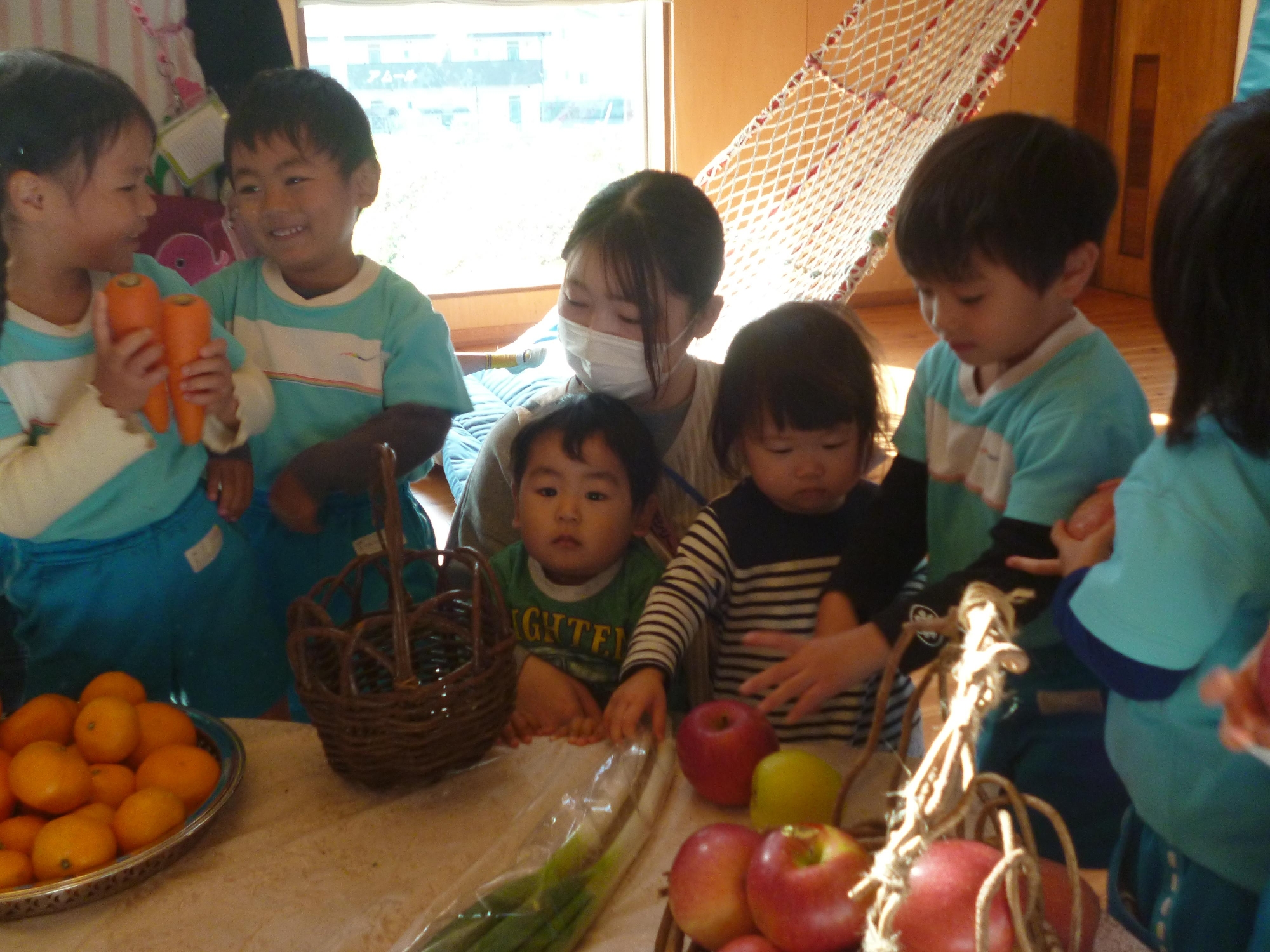 「あまいにおいがするよ。」「りんごをもってきたよ。」等、子どもたちは果物や野菜を見たり触ったり香りをかいだりしながら、楽しそうに話をしていました。