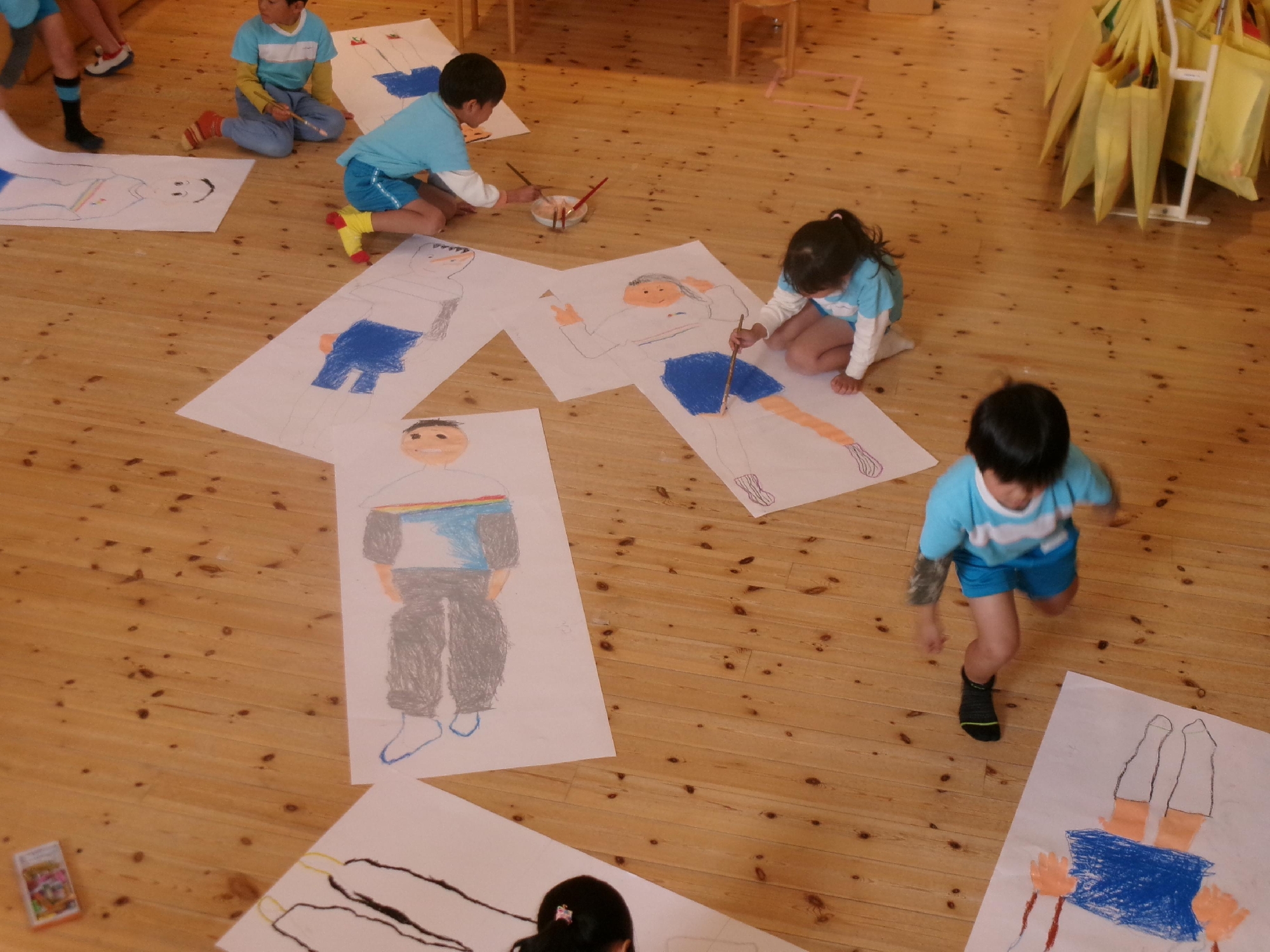 自分の等身大の絵を描きました。クレパスや絵の具を使って色塗りをしました。